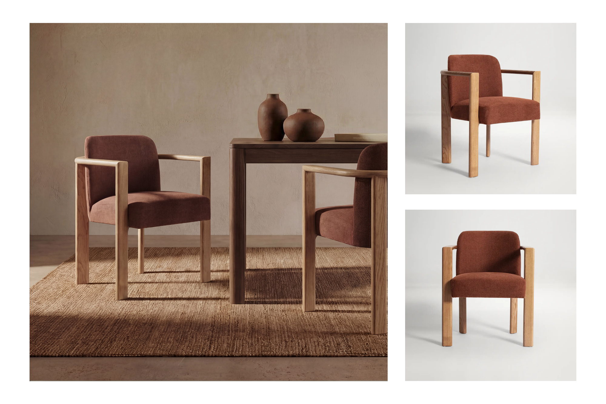 In a dining space, the Nora Dining Chair in Rust introduces warmth around the table. A solid ash wood frame and deep cushioned seat create a chair that feels sturdy and comfortable for long meals and easy conversation.
