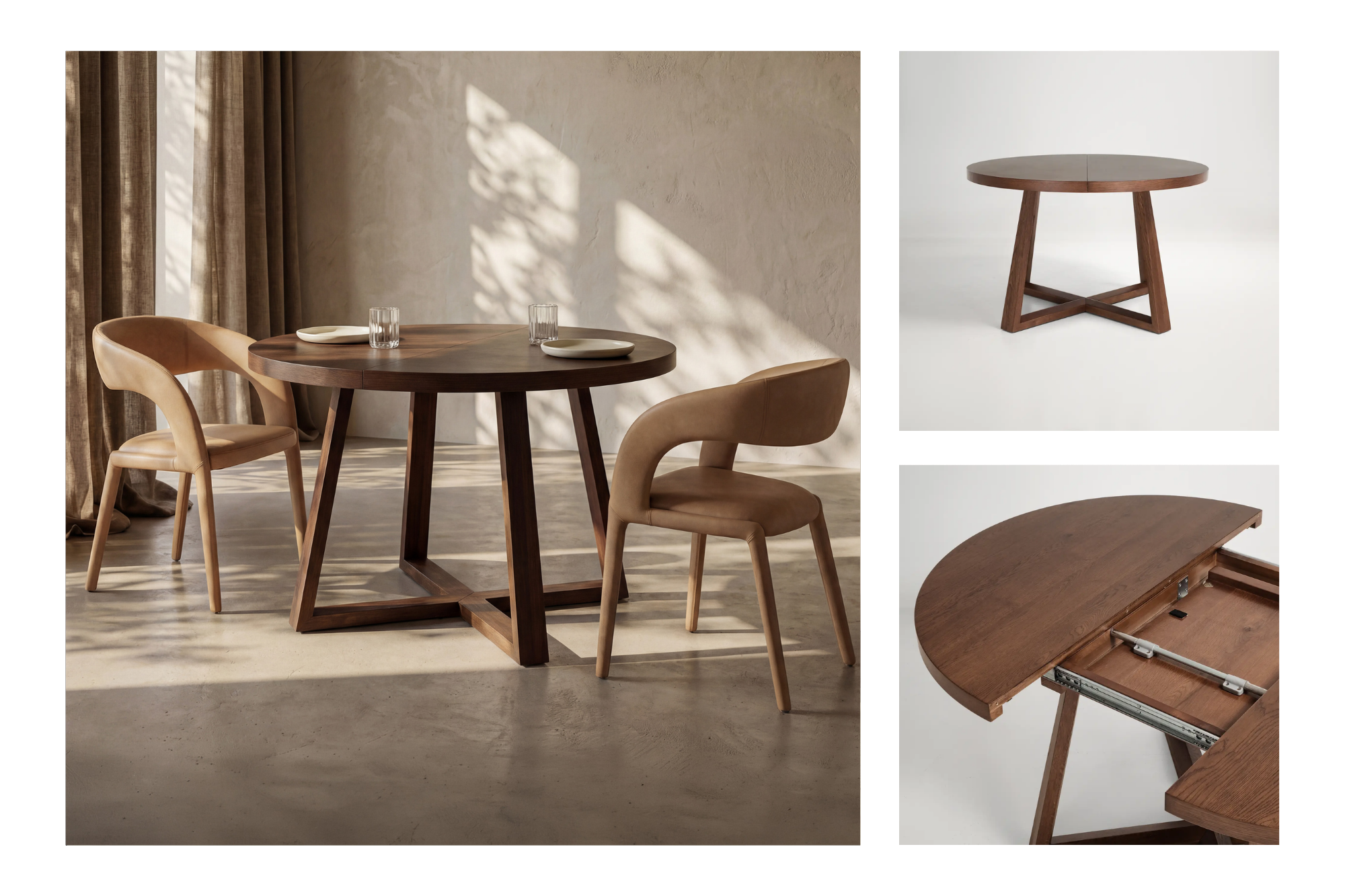 The Conrad Extension Dining Table in Walnut Brown is designed to grow with the moment. Its round form keeps the table feeling open and social, while a hidden butterfly extension allows it to expand when more guests arrive. By the end of the evening, chairs have shifted, plates are scattered, and the dining table has quietly done its job.