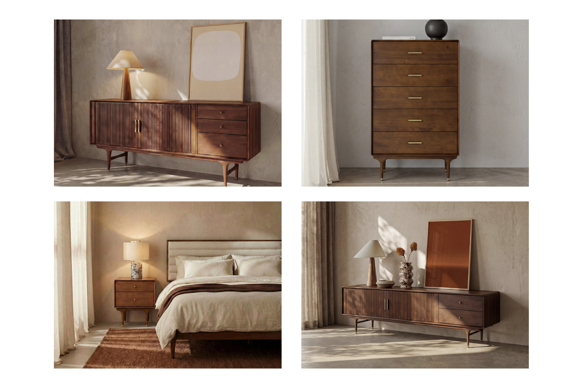 The Manhattan Collection carries the same warm walnut tone across multiple spaces. In the living room, the Manhattan TV Unit keeps media and devices tucked away behind sleek sliding doors. In the bedroom, the Manhattan Bed Frame, generous 5 drawer Manhattan Tallboy and the Manhattan Sideboard repeat the same timber finish and simple lines, creating a space that feels calm and consistent. The sophisticated palette draws on mid-century modern design. Clean lines. Warm poplar timber. Pieces that sit comfortably in everyday spaces.