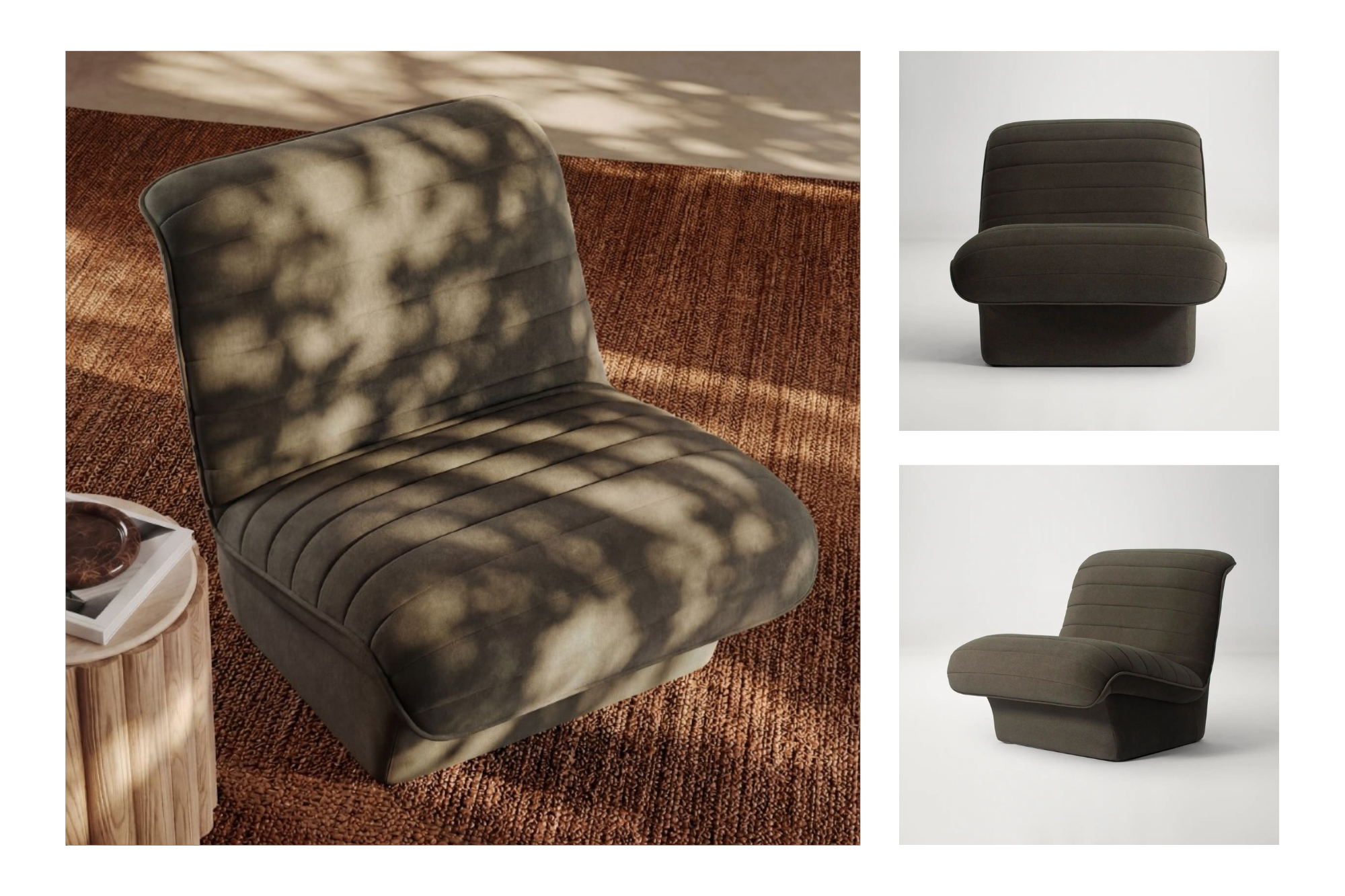 The Dwell Accent Chair in Olive brings richness through its mohair texture and vintage-inspired shape. Its deep seat invites people to settle in, while the sculptural frame adds character beside a sofa or near a window.